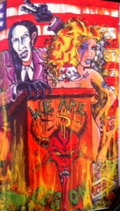 Hay una línea invisible más allá de la cual lo teatral pasa a ser ridículo y las personalidades creativas se convierten en parodias de sí mismas. Marilyn Manson hace mucho que la cruzó, y Lady Gaga nació directamente más allá de esa frontera. El primero quiso ser Alice Cooper más allá de Alice Cooper, la segunda se presentó como una Madonna (aún más) pasada de vueltas. Brian Warner jugó a ser satánico creando un magma de conceptos tan brutal y denso como el muro de sonido de su obra cumbre, Antichrist Superstar. A Stefani Joanne Angelina Germanotta no le hizo falta vender su alma al diablo: nació y germinó como flor oscura en el patio de recreo de Satanás, que es el mercado. Ambos han acabado siendo —y Lady Gaga en concreto nunca ha sido otra cosa— un espantajo y una mamarracha. Tal para cual, por tanto. Ladrón nos los presenta aquí como presidente y primera dama, o viceversa, de unos Estados Unidos paralelos donde la sacrosanta bandera de las barras y estrellas se representa en el estilo expresionista de Jasper Johns. Una bandera que no brilla resplandeciente bajo el sol de California, una enseña mate cuya pintura conserva el recuerdo aceitoso del óleo, cuyo trazo enérgico transmite la angustia gestual de un pintor que vio a las mejores mentes de su generación destruidas por la locura. Realmente, si algún mérito tiene Marilyn Manson fue el haber intentado sacar a la luz a través de su propuesta enfermiza esa América malsana, lóbrega, pantanosa, oscurantista, fanática, paleta, fea y obesa que oficialmente se trata de ocultar bajo un manto de producciones de Hollywood, cirugía creativa y uso indiscriminado de bótox. Los habitantes de ese subpaís patriotero y sobrealimentado son legión, su partido bien podría llamarse The Beautiful People, y no desentonarían como líderes dos personajes tan bizarros. Incluso podrían presentarse como una sola persona: Marilyn Gaga, o Lady Manson. Podrían someterse a una operación que los uniera por la cintura y los convirtiera en siameses, revertiendo así la historia de la cirugía y desafiando de paso la voluntad de dios. ¿No se trataba de eso, Mr. Manson? Sería una salida digna. Al igual que para un payaso debe de resultar triste dar miedo a los niños cuando pretende hacerlos reír, también debe de serlo que se tomen a broma tus intentos de epatar (cosa que no debería ser de extrañar si tu concepto de epatar es hacerte un traje de chuletas). A fin de cuentas, cuando en el crepúsculo de tu carrera veas que tu talento no volverá a asomar por el horizonte, métete a político. A Ronald Reagan no le fue nada mal.